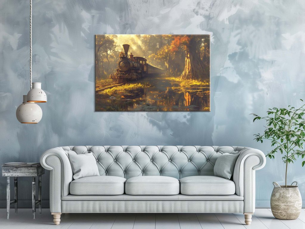 Na obraze vidíme starý parný vlak, ktorý sa pomaly presúva cez hmlistý, tajomný les. Svetlo prenikajúce cez husté koruny stromov osvetľuje trať a okolie, čím vytvára magickú atmosféru. Voda v jazierku vedľa trate odráža svetlo, čo dodáva obrazu ešte väčší nádych tajomna.