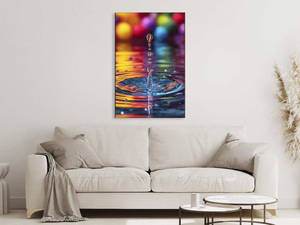 Fotografia zachytáva okamih, keď kvapka vody dosiahla vrchol svojho letu nad hladinou, vytvárajúc vertikálny rad menších kvapiek. Kvapka je odrážaná v pokojnej vodnej hladine, ktorá odzrkadľuje žiarivé farby pozadia. Scéna je plná dynamiky a farebnej hry, ktorá oživuje jednoduchosť a čistotu vodnej kvapky.o fotografie malé umelecké dielo.