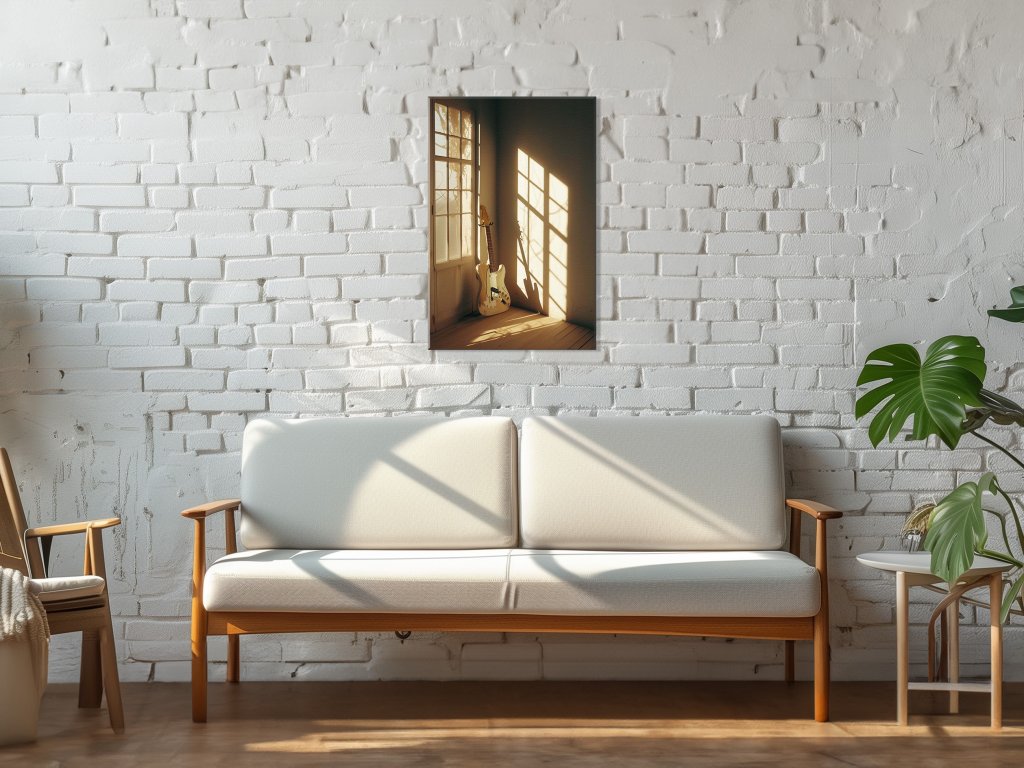 Na obraze je zobrazená elektrická gitara, ktorá je opretá o stenu vedľa okna, cez ktoré preniká jemné slnečné svetlo. Svetlo vytvára krásne tiene na podlahe a stene, čím vytvára pokojný a útulný atmosférický dojem. Obraz vyvoláva pocit nostalgie a ticha, ako keby sa hudba práve stíšila, aby umožnila slnečným lúčom prevziať scénu.