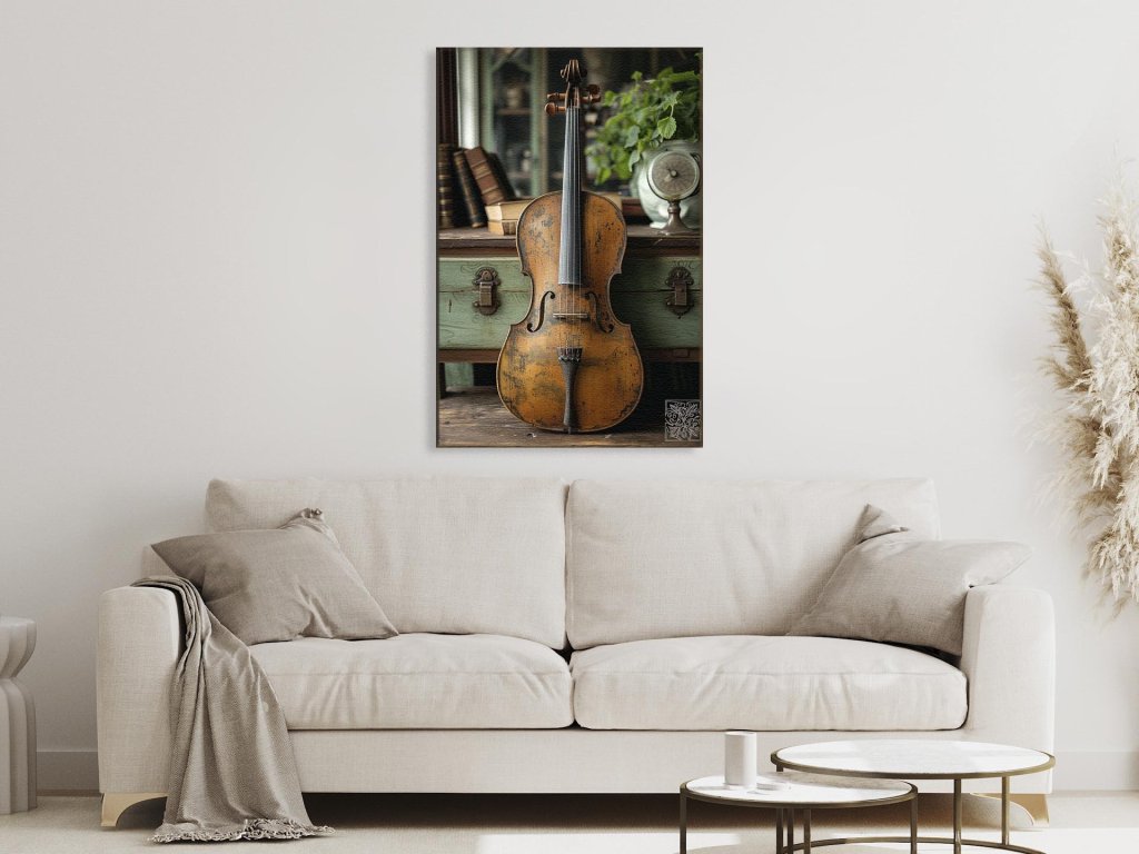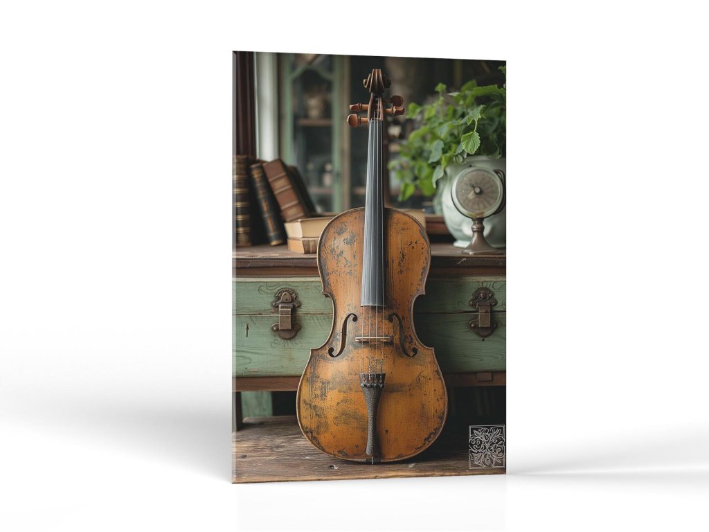 Na obrázku sú zobrazené antické husle s bohato patinovanou povrchovou úpravou, ktoré sú opreté o staromodnú zelenú skrinku s výrezmi. V pozadí sú viditeľné staré viazané knihy, čím sa naznačuje, že husle majú rovnako veľa príbehov a skúseností ako knihy za nimi. Rastlina a starožitný kompas vytvárajú dojem, že sa nachádzame v študovni alebo kancelárii s bohatou históriou. Celkový dojem je jeden z nostalgie a úcty k remeselnému umeniu a vedomostiam, ktoré pretrvávajú cez čas.