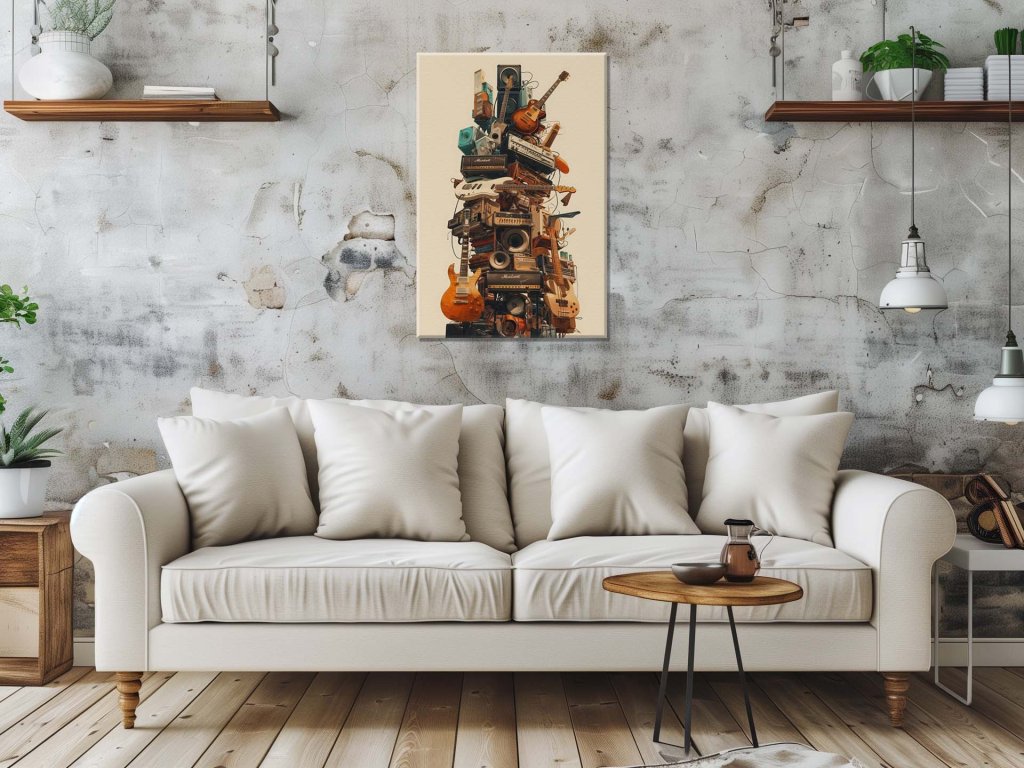 Tento obraz predstavuje originálnu vežu vytvorenú z rôznych hudobných nástrojov, zosilňovačov a reproduktorov, čím symbolizuje zmes hudobných žánrov a technológií. Zoskupenie gitár, zosilňovačov a ďalších zvukových zariadení vytvára dojem akustickej a vizuálnej harmónie. Výrazné kontrasty farieb a textúr dodávajú obrazu dynamiku a energiu, čím oslavuje kreativitu a hudobnú vášeň.