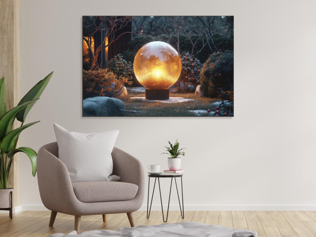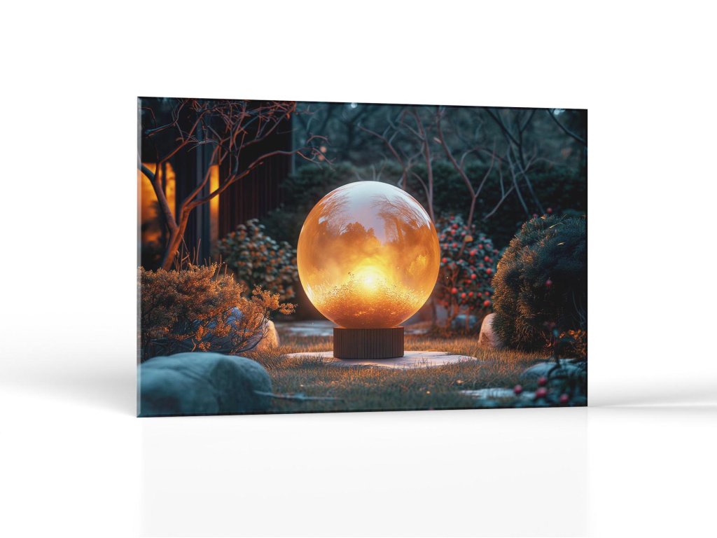 Veľká svetelná guľa umiestnená na podstavci v pokojnej záhrade, ktorá odráža a zosilňuje svetlo zapadajúceho slnka. Scéna je nasiaknutá pokojnou atmosférou, s kúzelnými tónmi západu slnka v pozadí a súhrou tieňov a svetla medzi rastlinami. Tento obraz vytvára pocit tepla a pohody, s dôrazom na harmonickú spoluprácu prirodzeného a umelého svetla.