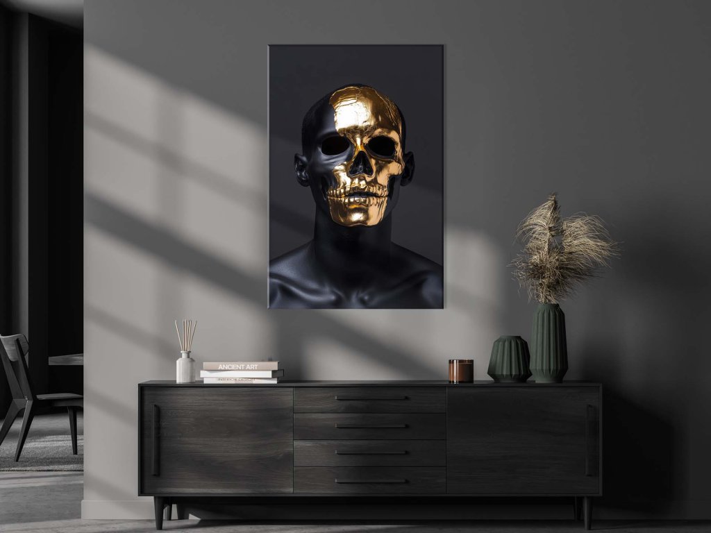 Obraz zobrazuje tvár, kde polovica masky je lesklá zlatá lebka, zatiaľ čo druhá polovica je čierna, čím vytvára kontrast medzi svetlom a temnotou. Tento výtvor kombinuje prvky elegancie a tajomnosti, pričom maska zdôrazňuje silný výraz. Celková atmosféra obrazu vyvoláva pocit záhady, s dôrazom na rovnováhu medzi krásou a nebezpečenstvom.