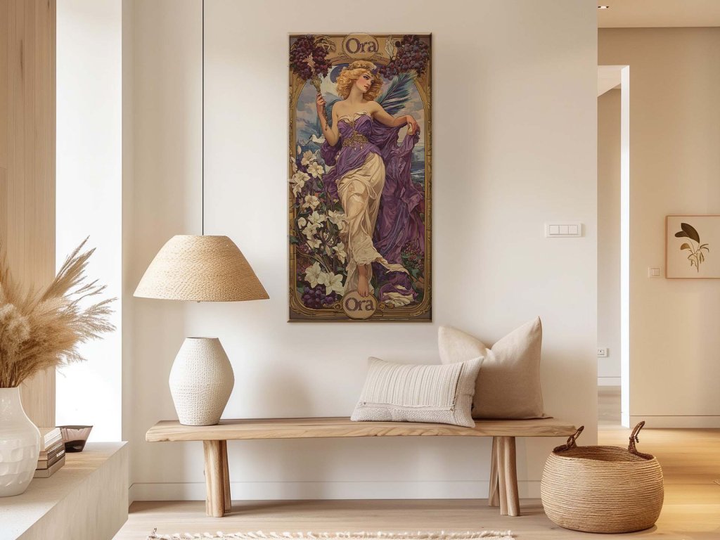 Na obraze je znázornená bohyňa s dlhými zlatými vlasmi, oblečená v bohatých fialových a krémových šatách, držiaca hrozno a kvetinu v rukách. Je obklopená rastlinami, kvetmi a symbolmi hojnosti, ktoré odkazujú na plodnosť a úrodu. Pozadie je zdobené jemnými detailmi, pričom celý obraz vyžaruje pocit pokoja a hojnosti, symbolizujúci nadbytok prírody.