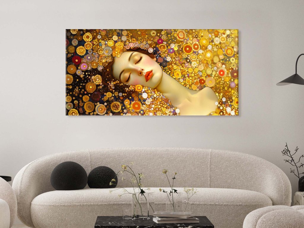 Tento obraz zachytáva krásnu ženu v hlbokom spánku, jej tvár vyžaruje pokoj a jemnosť. Okolitý priestor je zaplavený zlatými a ornamentálnymi kruhmi, ktoré pripomínajú dielo Gustava Klimta, pričom dodávajú obrazu luxusný a éterický charakter. Celková kompozícia pôsobí ako vizuálna symfónia pokoja, elegancie a snovej fantázie.
