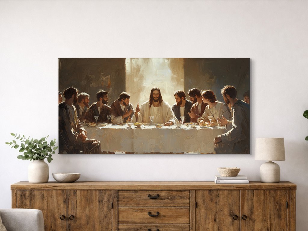 Na obraze je zobrazená slávna scéna z Poslednej večere, kde Ježiš Kristus sedí uprostred stola, obklopený svojimi dvanástimi učeníkmi. Ježiš zdvihol ruku, akoby hovoril, a svetlo, ktoré na neho dopadá, zdôrazňuje jeho dôležitosť v tejto chvíli. Atmosféra obrazu je pokojná, no zároveň naplnená duchovným významom a očakávaním udalostí, ktoré nasledujú.