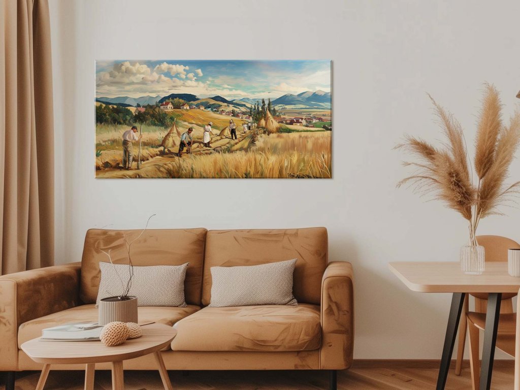 Obraz zobrazuje skupinu dedinčanov, ktorí pracujú na žatve, pričom pozadie tvorí malebná dedinka obklopená zlatými poliami a vrchmi. Muži a ženy s tradičnými nástrojmi zbierajú obilie, pričom slnečné svetlo osvetľuje celú scenériu a vytvára pokojnú atmosféru vidieckeho života. V pozadí sú viditeľné hory a domčeky, ktoré dodávajú obrazu harmóniu medzi prírodou a ľudskou prácou.