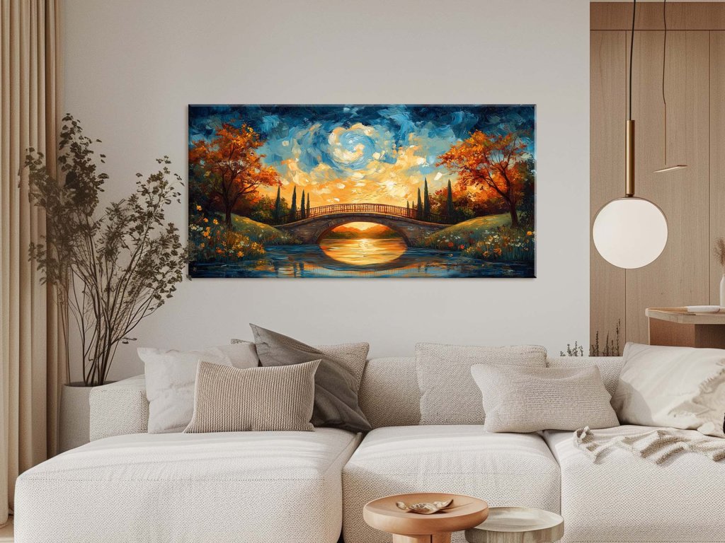 Tento obraz zachytáva pokojný večerný okamih, keď zapadajúce slnko odráža svoje zlaté lúče na pokojnej hladine rieky. Most v strede obrazu spája dve strany rieky, pričom obloha je plná fascinujúcich farieb a textúr. Stromy naokolo žiaria jesennými farbami, čo pridáva celkovej kompozícii harmóniu a teplú atmosféru.