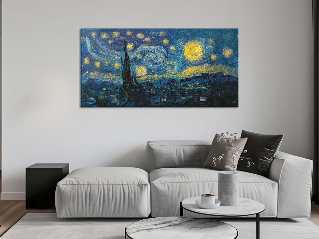 Tento obraz zachytáva dramatickú scénu nočnej oblohy, kde hviezdy a mesiac vytvárajú dojem neustáleho pohybu. Sýte modré a žlté farby zvýrazňujú kontrast medzi pokojom dediny a dynamikou neba. Obraz vyvoláva dojem snovosti a nekonečna, kde sa zem a obloha stretávajú v poetickom víre.