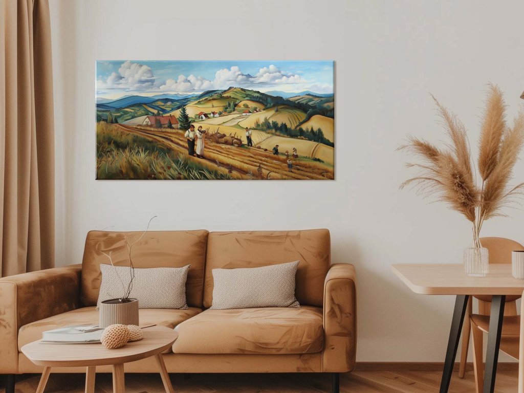 Na obraze je zobrazená rodina, ktorá počas žatvy pracuje na poli, zatiaľ čo v pozadí sa črtá nádherná kopcovitá krajina a dedinské domy. Starší muž s kosou a matka s dieťaťom symbolizujú tradičné hodnoty a harmóniu medzi prírodou a rodinou. Celková atmosféra je pokojná a plná tepla, čo evokuje spomienky na jednoduchý, ale šťastný život na vidieku.