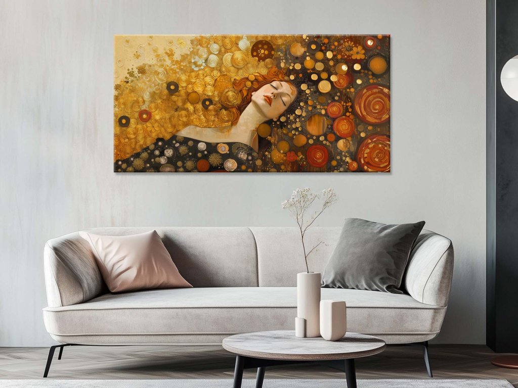 Obraz zachytáva ženu s ohnivými vlasmi, ktorá pokojne spočíva, ponorená do svojich snov. Okolo nej sa rozvíjajú zlaté a bronzové kruhové ornamenty, symbolizujúce harmóniu a bohatstvo jej vnútorného sveta. Celková atmosféra obrazu vyžaruje eleganciu, pokoj a mystickú krásu, čím divákovi sprostredkuje pocit pohody a snovej transcendencie.