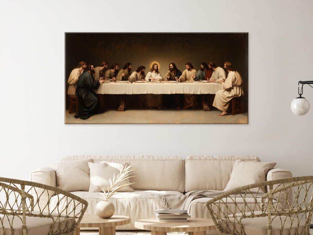 Obraz zachytáva silný duchovný moment Poslednej večere, kde Ježiš sedí uprostred svojich dvanástich učeníkov. Každý z nich vyjadruje inú emóciu — od prekvapenia po tichú oddanosť, čím sa umocňuje napätie tejto významnej biblickej udalosti. Kompozícia a svetlo sú sústredené na Ježiša, ktorý je centrom pokoja a duchovného vedenia v tejto dramatickej chvíli.