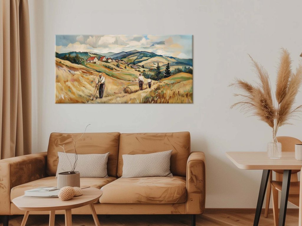 Obraz zobrazuje skupinu roľníkov, ktorí pracujú na poliach uprostred krásnej kopcovitej krajiny. Dedinské domy sú roztrúsené v diaľke, zatiaľ čo ľudia zbierajú seno a pripravujú ho na zimu. Atmosféra obrazu je pokojná, s nádychom tradície a harmónie medzi ľudskou prácou a prírodou.