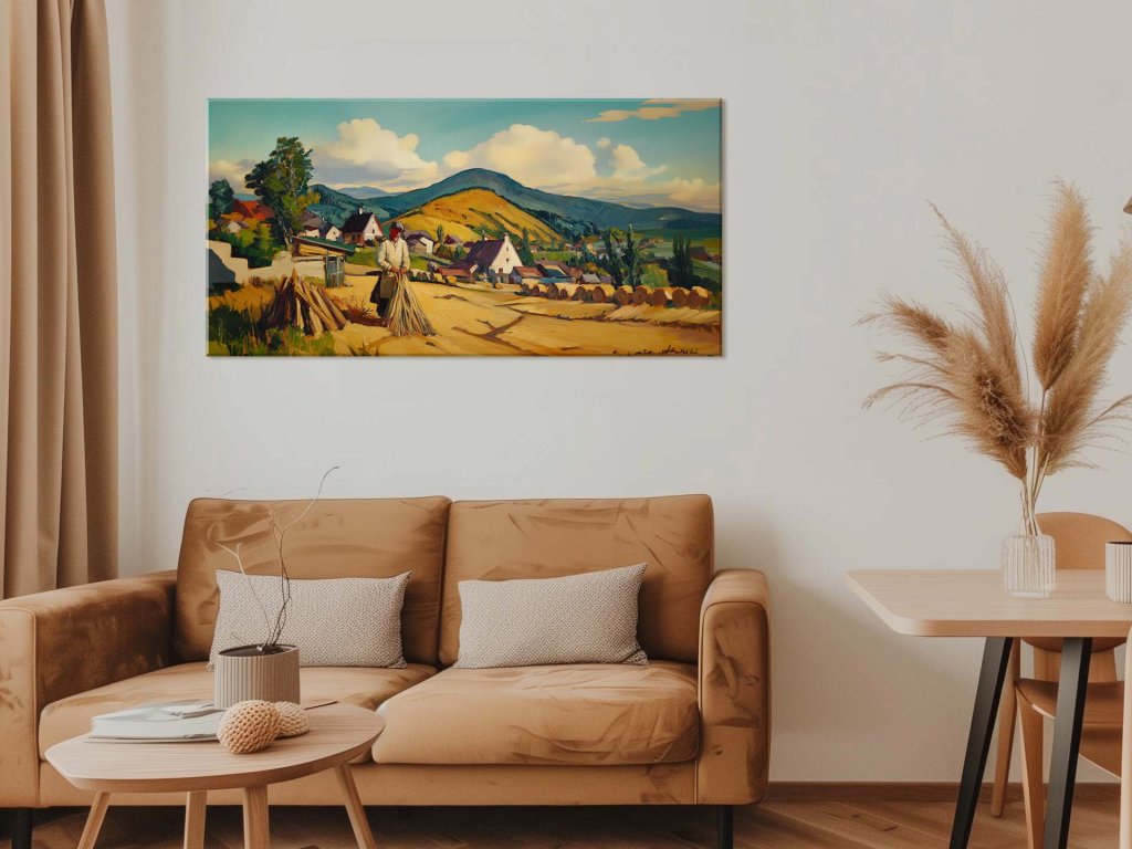 Na obraze vidíme pokojný vidiecky život, kde muž zberá úrodu v zlatom poli. V pozadí sú domčeky dediny rozložené medzi kopcami, ktoré dodávajú obrazu krásnu krajinnú perspektívu. Obloha je jasná s bielymi oblakmi, čo vytvára atmosféru kľudu a práce na čerstvom vzduchu.