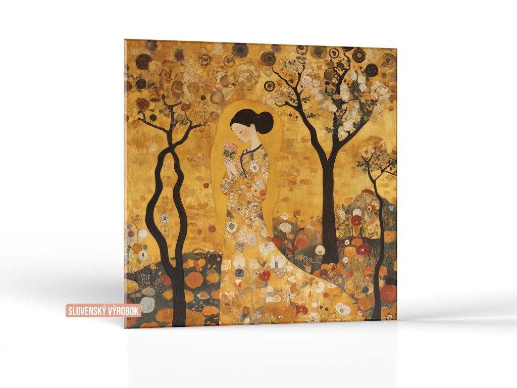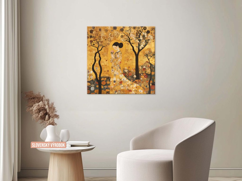 Obraz zobrazuje éterickú ženu obklopenú prírodou, zahalenú v šatách bohatých na zlaté ornamenty a kvetinové vzory. Zlaté pozadie a jemné detaily vytvárajú snovú atmosféru, kde sú stromy a kvety súčasťou harmónie medzi človekom a prírodou. Kompozícia vyniká eleganciou a ladnosťou, pričom zdôrazňuje jemnosť a krásu ženskosti.