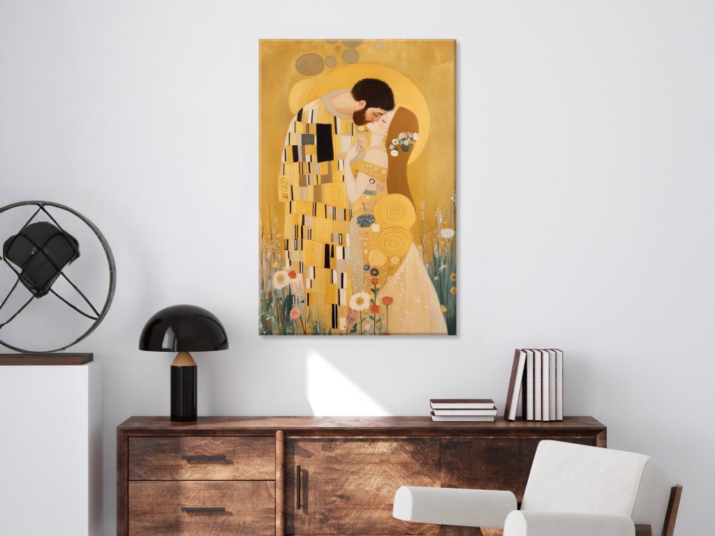 Tento obraz zobrazuje zamilovaný pár v intímnom objatí, obklopený zlatou aurou a ornamentálnymi vzormi. Kompozícia vyjadruje spojenie tela i duše, pričom ich šaty sú prepletené geometrickými tvarmi, ktoré evokujú večnosť. Scéna je zároveň poetická aj mystická, čím oslavuje krásu ľudskej lásky v najčistejšej podobe.
