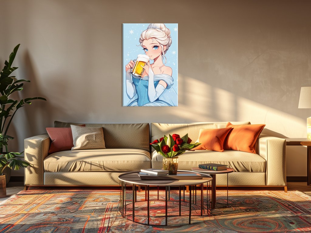 Tento obraz zobrazuje anime princeznú s dlhými blond vlasmi a modrými očami, ktorá drží pohár piva. Je oblečená v elegantných modrých šatách, ktoré kontrastujú s bledomodrým pozadím plným snehových vločiek. Princezná sa usmieva a pôsobí uvoľnene, čo dodáva obrazu zábavnú a neobvyklú atmosféru.