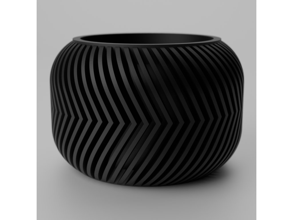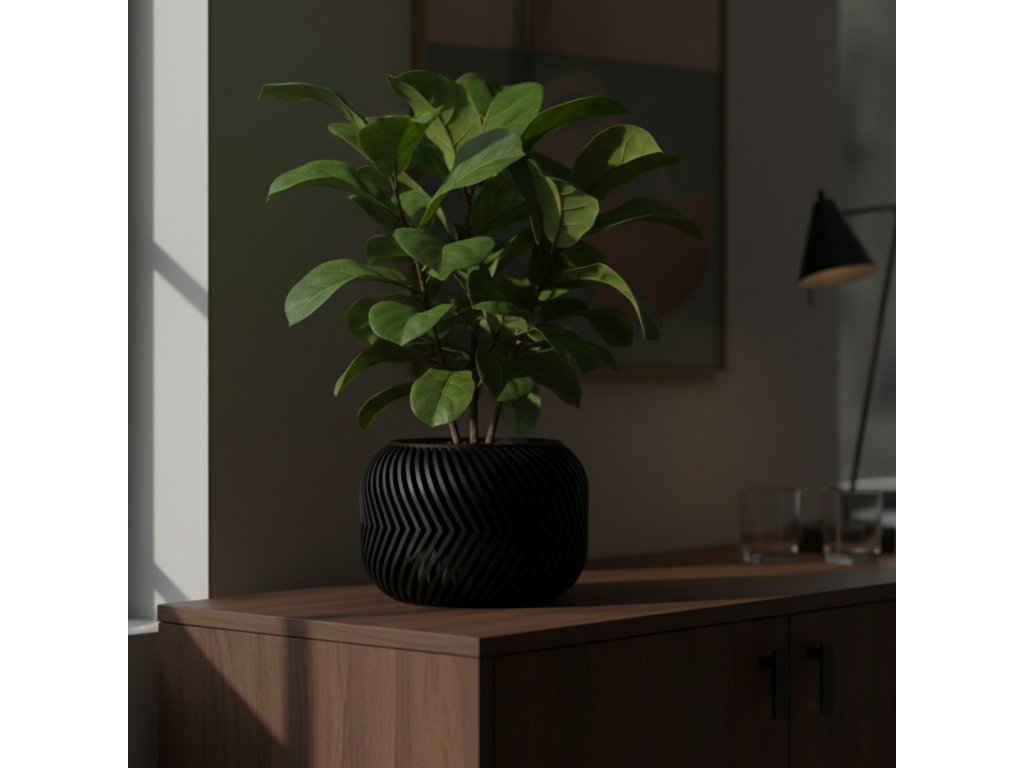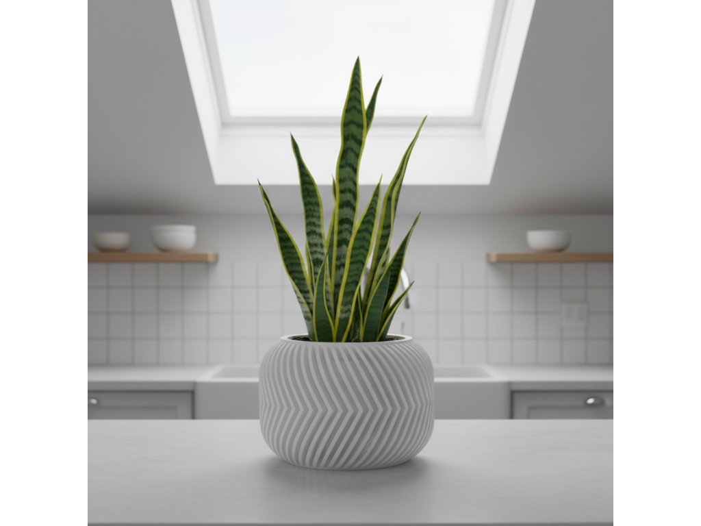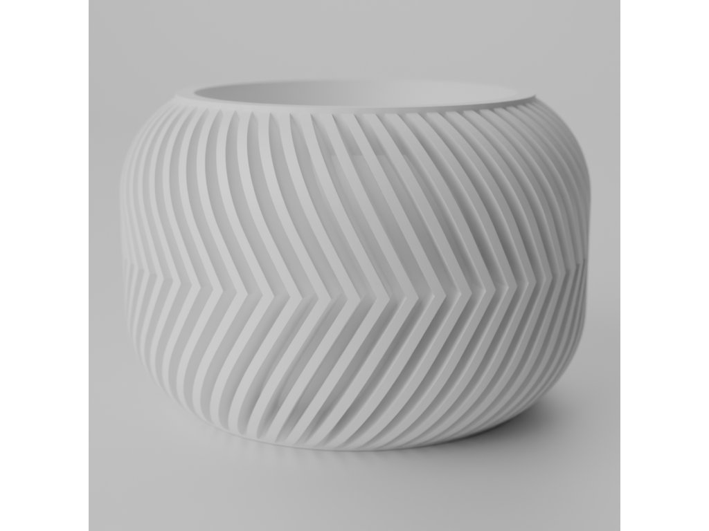 Kvetináč Evron zaujme už na prvý pohľad svojím výrazným, geometrickým vzorom, ktorý vytvára ilúziu pohybu a hĺbky. Precízne 3D tvarovanie vo forme šípových liniek dodáva celku výnimočný vizuálny rytmus a robí z neho moderný doplnok s charakterom.
