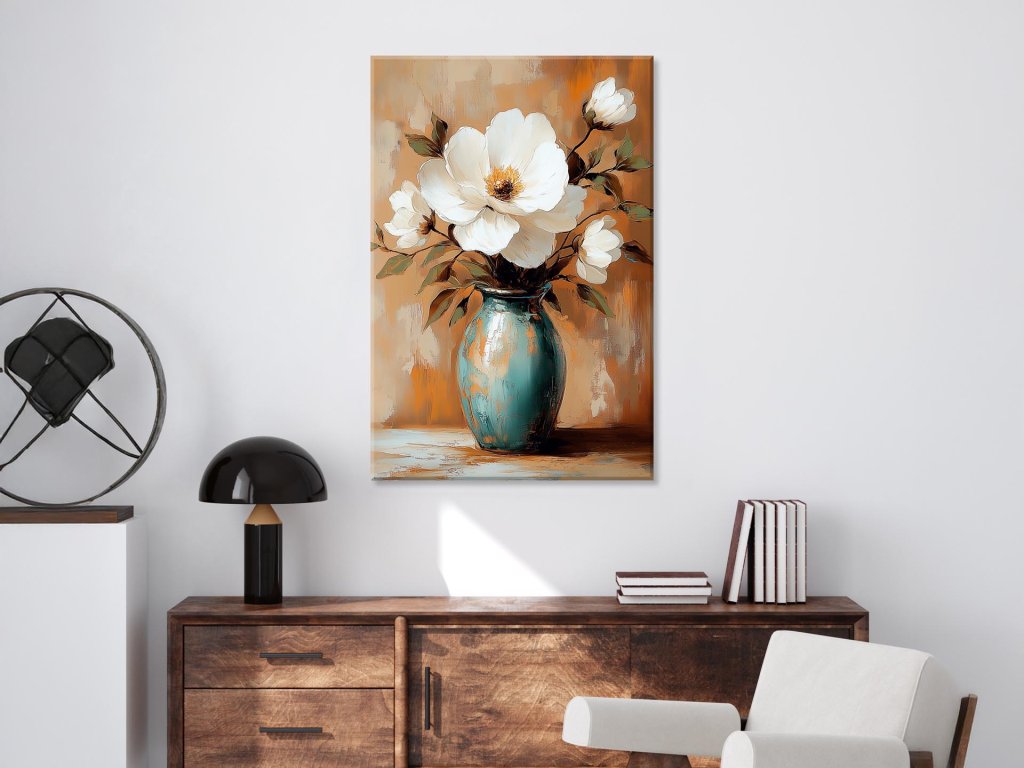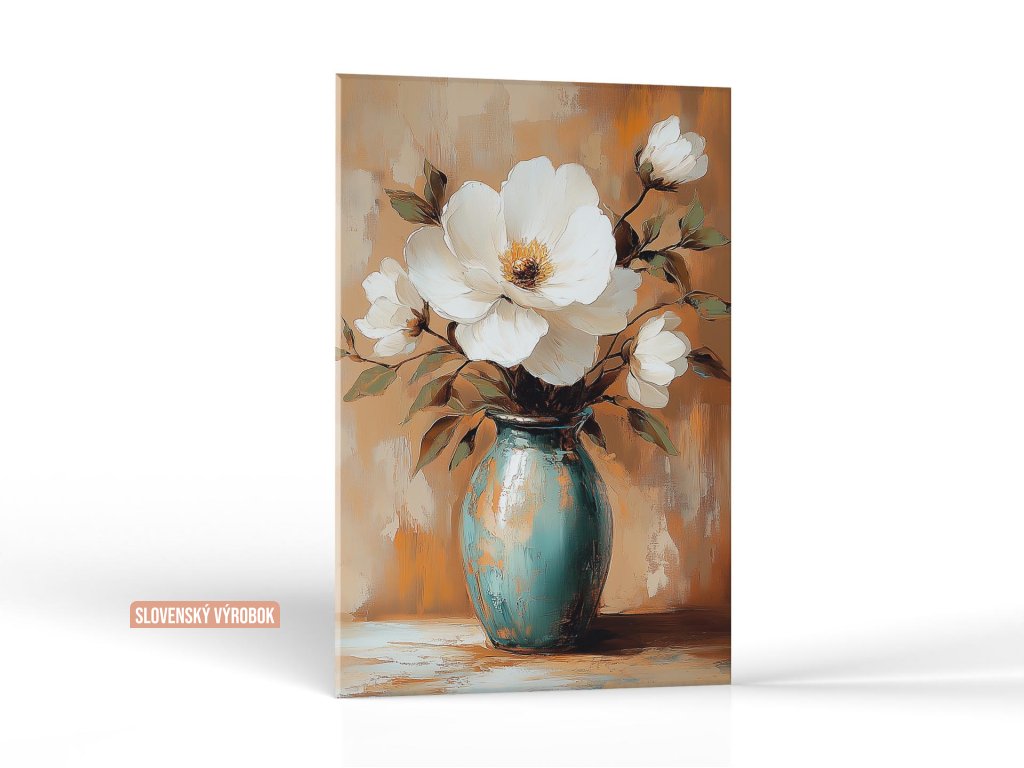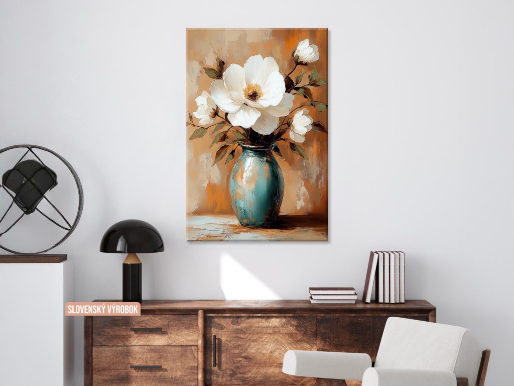Tento obraz zachytáva elegantné biele kvety s jemne zlatistým stredom, ktoré sa rozvíjajú z rustikálnej tyrkysovej vázy. Pozadie je teplé, textúrované a pôsobí ako starý omietnutý múr, čím dodáva dielu vintage atmosféru. Celková kompozícia vytvára pokojnú, no výraznú estetiku vhodnú do klasických aj moderných interiérov.