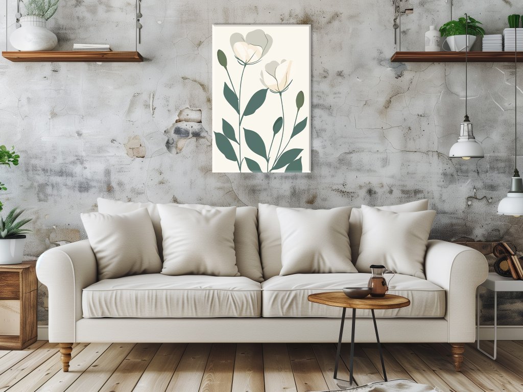 Tento obraz zobrazuje elegantné kvety s jemnými kontúrami, ktoré sú umiestnené na svetlom, neutrálnom pozadí. Listy a kvety sú zobrazené v rôznych odtieňoch zelenej a béžovej farby, čo vytvára harmonickú kompozíciu. Minimalistický štýl obrazu vyzdvihuje krásu a jednoduchosť prírody, čím pôsobí upokojujúco a esteticky príjemne.