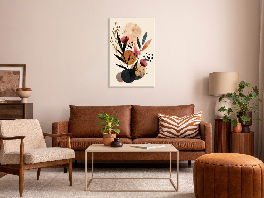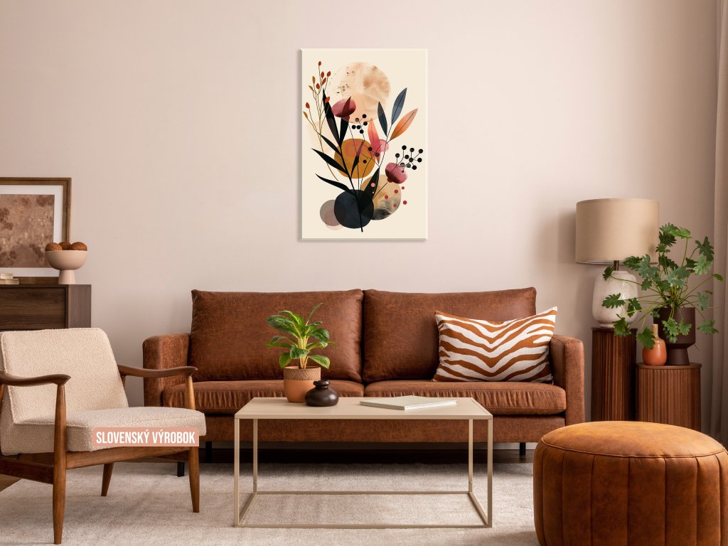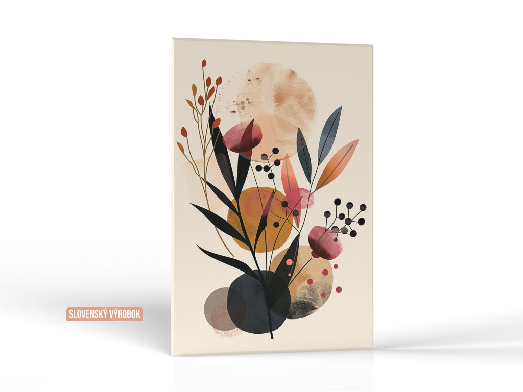 Tento obraz predstavuje modernú abstraktnú kompozíciu kvetov a lístia, ktoré sú zvýraznené v teplých odtieňoch oranžovej, hnedej a červenej farby. Siluety rastlín a geometrické tvary vytvárajú harmonický a vyvážený celok. Obraz pôsobí pokojne a elegantne, pričom farby a tvary vyvolávajú príjemné pocity a estetický zážitok.