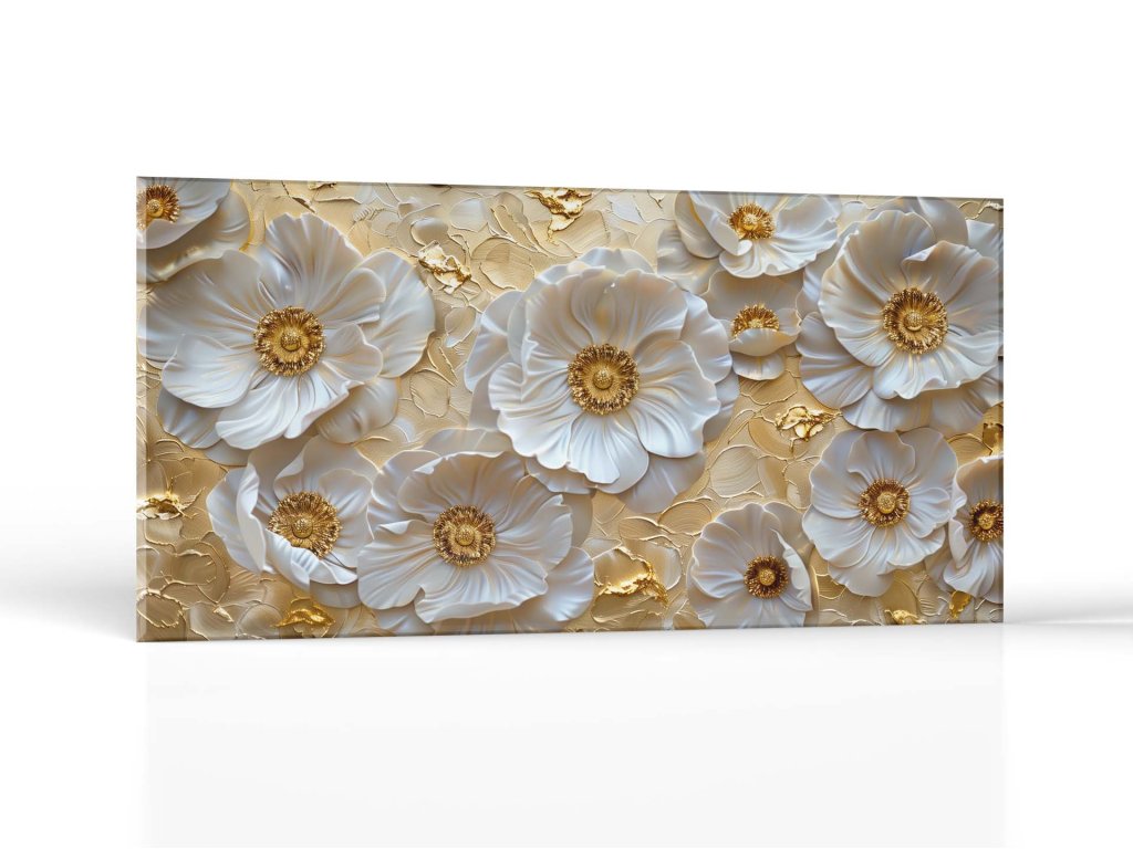 Tento obraz zobrazuje abstraktné kvety, kde kvety majú jemné biele lupene a výrazné zlaté pozadie. Kvety sú usporiadané na pozadí v teplých zlatých odtieňoch, čo vytvára luxusný a elegantný dojem. Maľba je bohatá na textúru a detail, čím do interiéru prináša sofistikovanú krásu a estetickú hodnotu.