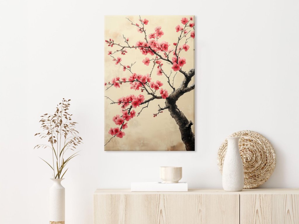 Obraz zobrazuje vetvy sakurového stromu, ktoré sú obsypané sýtoružovými kvetmi v rôznych štádiách rozkvetu. Tmavý kmeň a vetvy vytvárajú kontrast s jemným béžovým pozadím a ešte viac zvýrazňujú krásu a krehkosť kvetov. Celková kompozícia pôsobí jemne, harmonicky a pripomína tichú silu jari a obnovy.