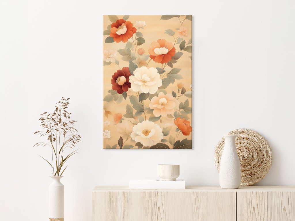 Tento obraz zobrazuje bohato rozkvitnuté kvety s jemne vrstvenými lupeňmi v harmonickej palete teplých farieb, od krémovej po sýtu červeň. Kontrast medzi kvetmi a jemne zelenými listami vytvára vizuálnu rovnováhu a podčiarkuje prirodzenú krásu kompozície. Tlmené pozadie s teplým nádychom podporuje pocit nostalgie, pokoja a elegancie.