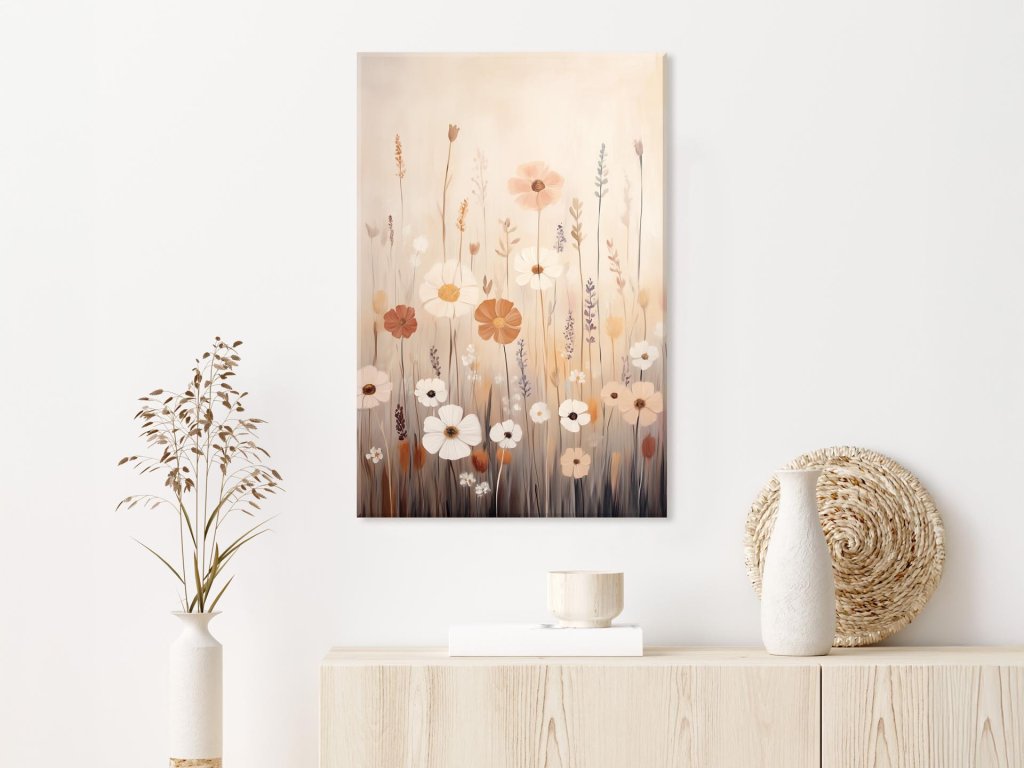 Tento obraz zobrazuje pokojnú scenériu letnej lúky plnej rôznorodých poľných kvetov v teplých odtieňoch bielej, béžovej a oranžovej. Kvety sa jemne vznášajú nad zemitým podkladom, ako by sa hojdali v miernom vánku. Celková kompozícia pôsobí harmonicky a nostalgicky, navodzujúc pocit tichej radosti a spojenia s prírodou.