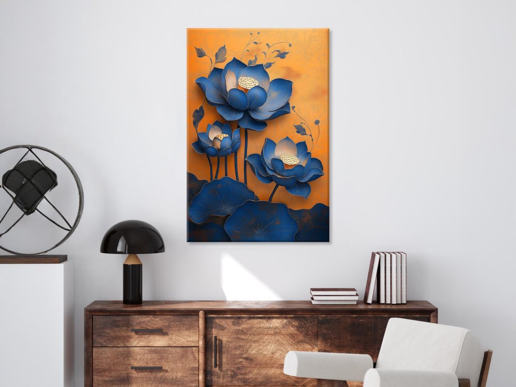 Tento obraz zobrazuje nádherné modré lotosové kvety v plnom rozkvete, ktoré vystupujú zo zlatého, teplého pozadia. Hra kontrastných farieb – sýtej modrej a teplej oranžovej – vytvára výrazný vizuálny zážitok. Jemné línie a detailné spracovanie kvetov pôsobia sofistikovane a vyvolávajú pocit pokoja a vznešenosti.