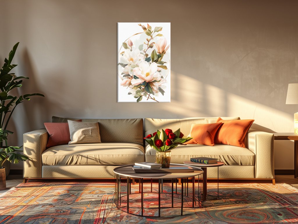 Tento obraz zobrazuje nádhernú kompozíciu kvitnúcich magnólií s jemnými, ružovkastými a bielymi lístkami, ktoré sú prepletené so zelenými listami. Kvety sú usporiadané do elegantného kruhu, čo dodáva obrazu harmonický a pokojný vzhľad. Svetlé a jemné farby vytvárajú dojem jemnosti a krehkosti, pričom zvyšujú celkovú estetiku obrazu.