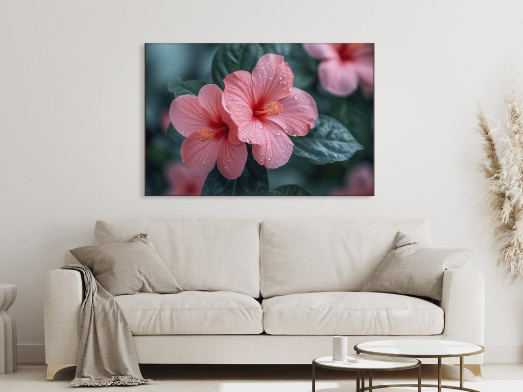 Obraz zobrazuje dva výrazné ružové kvety ibišteka s jemne padajúcimi kvapkami rosy na ich jemných lístkoch. Kvety sú zobrazené s hlbokým zeleným pozadím, ktoré zvýrazňuje ich farbu a detaily. Kompozícia a svetlo podčiarkujú sviežosť a krehkú krásu kvetov.
