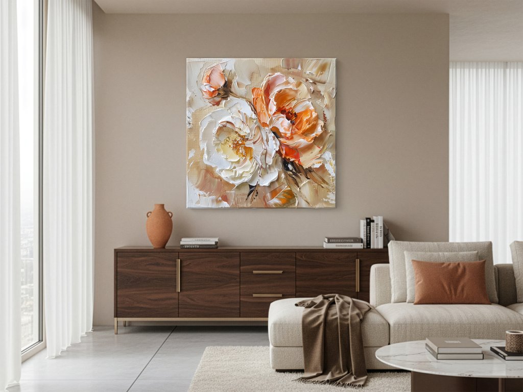 Tento obraz zobrazuje abstraktné kvety akoby maľované olejovými farbami, ktoré sú bohaté na textúru a detaily. Kvety v teplých odtieňoch oranžovej a krémovej farby vynikajú na jemnom pozadí, čím vytvárajú dynamický a živý dojem. Maľba je plná pohybu a farieb, čo dodáva priestoru energiu a umelecký výraz.