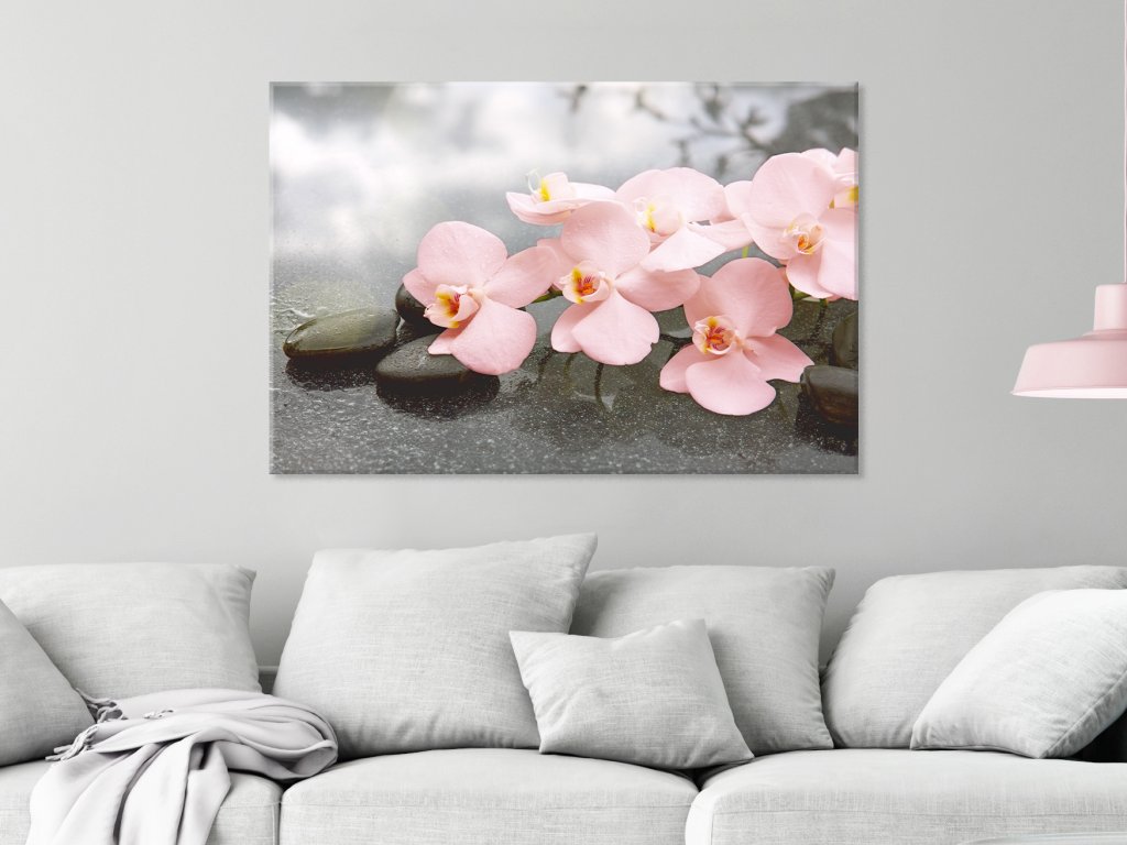 Obraz zachytávajúci krehkú krásu ružových orchideí položených na hladkých, tmavých kamienkoch, obklopených jemnými kvapkami vody, čo dodáva scénu pokojný a harmonický nádych. Orchidey svojou jemnou farbou kontrastujú s tmavosivým podkladom, čo vytvára úžasný zážitok plný rovnováhy a pokoja. Scéna navodzuje atmosféru relaxácie a prírodného kúpeľného prostredia.