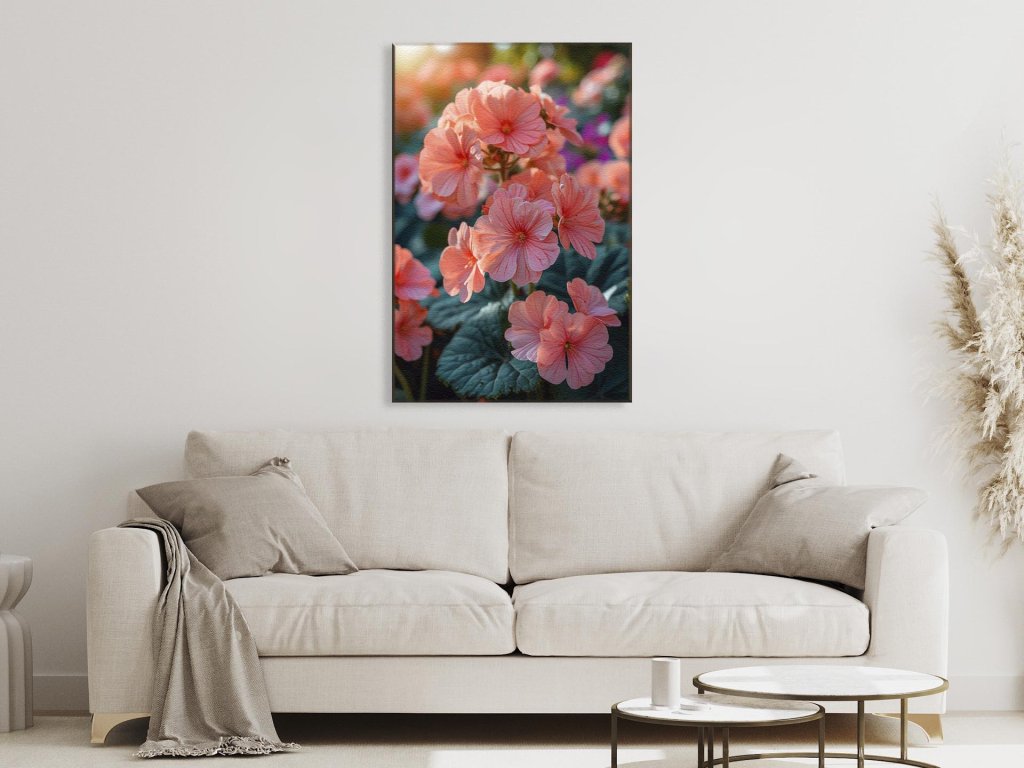 Tento obraz zachytáva živé pelargónie s pastelovo oranžovými kvetmi, ktoré sú osvetlené teplým svetlom, čo im dodáva mäkkú a príjemnú atmosféru. Kvetinové lístky sú jemne orosené, čo dodáva obrazu pocit sviežosti a čerstvosti. Rastliny sú zobrazené na pozadí rozostrených zelených listov, ktoré zvýrazňujú krásu a farebnosť kvetov.