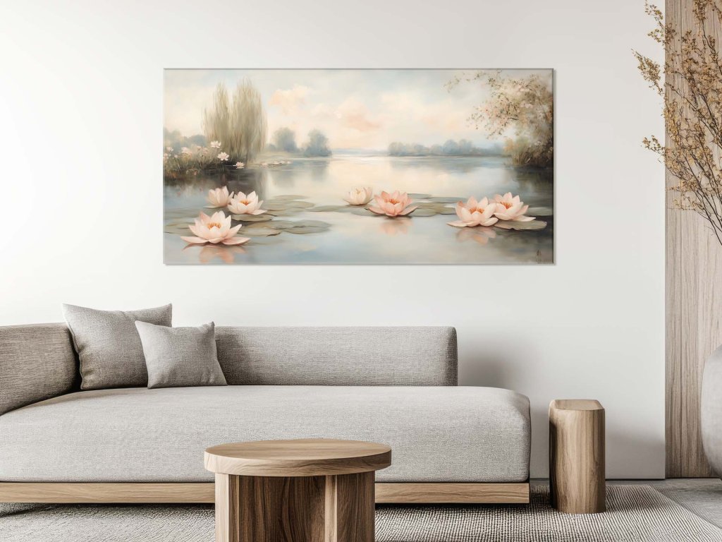 Obraz zachytáva pokojnú scenériu jazera s rozkvitnutými lekniami na hladine, ktoré pôsobia jemne a harmonicky. V pozadí sa rozplýva jemná hmla, ktorá dodáva výjavu tajomnú a snovú atmosféru. Scéna vyžaruje ticho a vyrovnanosť, akoby sa čas na chvíľu zastavil v nežnom objatí prírody.