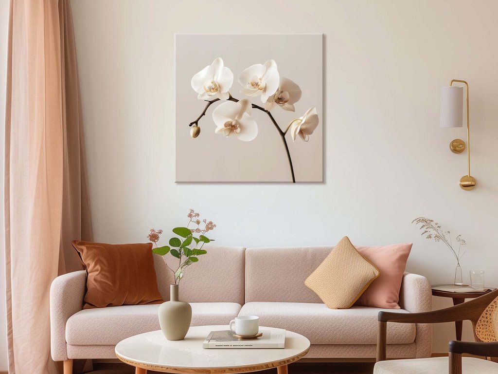 Tento obraz zachytáva nádhernú eleganciu bielych orchideí, ktoré sa harmonicky tiahnu po tenkom stonku. Jemné krivky kvetov a ich krémová farba kontrastujú s neutrálnym pozadím, čím vyzdvihujú ich sofistikovanosť. Orchidey sú symbolom čistoty a pokoja, čo z tohto obrazu robí pokojný a nadčasový vizuálny zážitok.