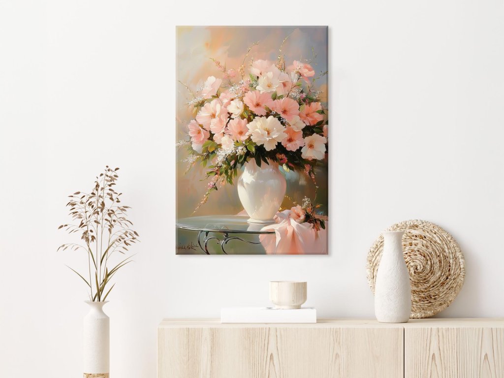 Tento obraz zachytáva krehkú krásu kvetinového aranžmánu zloženého z pastelových ružových a bielych kvetov. Kvety sú zasadené v jednoduchej, ale elegantnej bielej váze, ktorá stojí na jemne lesklom sklenenom stolíku, lemovanom ružovou látkou. Mäkké svetlo v pozadí dodáva scéne romantickú a pokojnú atmosféru, akoby sa prebúdzala do tichého jarného rána.