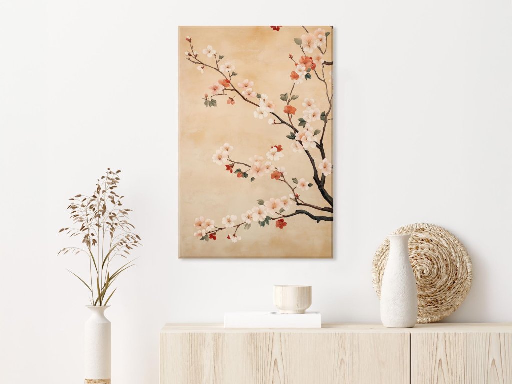 Obraz zachytáva vetvy čerešňového kvetu s jemnými ružovými a červenými kvetmi na béžovom pozadí.