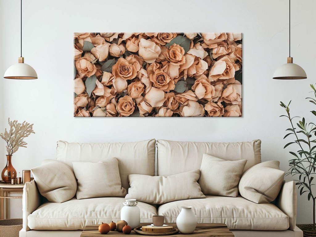 Tento obraz zachytáva detaily zvädnutých ruží, ktoré si zachovávajú svoju krásu aj po odkvitnutí. Jemné tóny orieškovej a béžovej farby vytvárajú harmonický kontrast s matnými zelenými listami. Obraz vyvoláva pocit nostalgie a pripomína pominuteľnosť času a krásy.