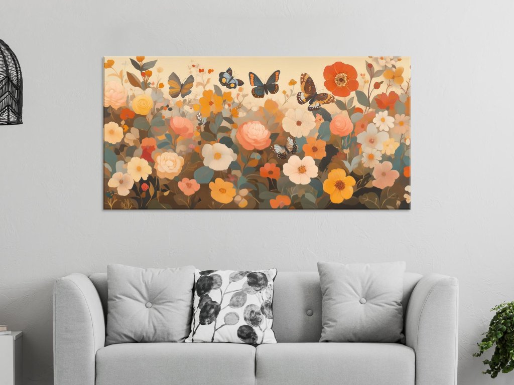 Tento obraz zachytáva poetickú scenériu, v ktorej sa desiatky motýľov vznášajú nad bohatým kvetinovým záhonom plným teplých odtieňov ružovej, žltej a oranžovej. Kvety rôznych tvarov a veľkostí spolu s motýľmi vytvárajú živý tanec plný radosti a pohybu. Celá kompozícia pôsobí ako oslava leta, prírody a krehkosti života vo farebnom výtvarnom štýle.