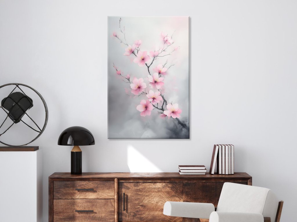 Obraz znázorňuje jemné vetvičky s ružovými kvetmi, ktoré akoby vyrastali z hmly snov. Ich pastelová krása a plynulé línie pôsobia upokojujúco a poeticky. Kompozícia vytvára dojem pokojného rána, kedy sa jar prebúdzala do svetla bez slov.