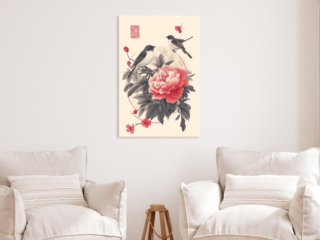 Tento obraz zachytáva jemnú rovnováhu medzi prírodou a pokojom, kde sa dva vtáky usadili medzi listami a kvetmi vo výnimočne detailnom a harmonickom kompozícii. Dominantný červený kvet pivonky symbolizuje krásu a vitalitu, zatiaľ čo elegantné čierno-biele vtáky prinášajú kontrast a ticho. Celé dielo má estetiku tradičnej východoázijskej ilustrácie, ktorá vyžaruje pokoj a jemnosť.
