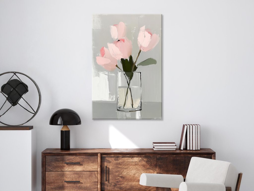 Obraz zachytáva štyri jemne ružové kvety vo vysokej sklenenej váze, namaľované minimalistickým, no zároveň expresívnym štýlom. Vzhľad hrubých ťahov štetca dodáva kvetom štruktúru a živý charakter, pričom neutrálny sivý podklad zvýrazňuje ich jemnosť. Tento výjav pôsobí upokojujúco a vyvoláva dojem ticha, rovnováhy a každodennej elegancie.