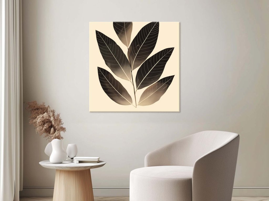 Tento obraz zachytáva krásu prírody prostredníctvom tmavých listov, ktoré sú elegantne usporiadané na vetvičke. Jemné tieňovanie a detaily žilkovania dodávajú obrazu hĺbku a realistický vzhľad. Na svetlom pozadí vynikajú kontúry listov, čím obraz získava moderný, minimalistický nádych.