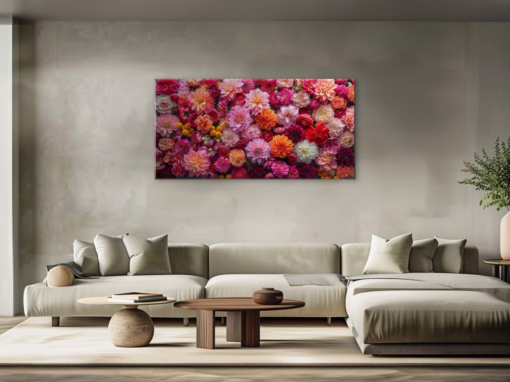 Tento obraz zobrazuje pôsobivú kompozíciu rôznofarebných kvetov, ktoré vytvárajú ohromujúcu mozaiku. Každý kvet je detailne vykreslený, s pestrou paletou farieb od jemnej ružovej až po intenzívnu červenú a oranžovú. Kombinácia rôznych tvarov a odtieňov kvetov vytvára harmonickú a vizuálne príťažlivú scénu, ktorá oslavuje krásu prírody.
