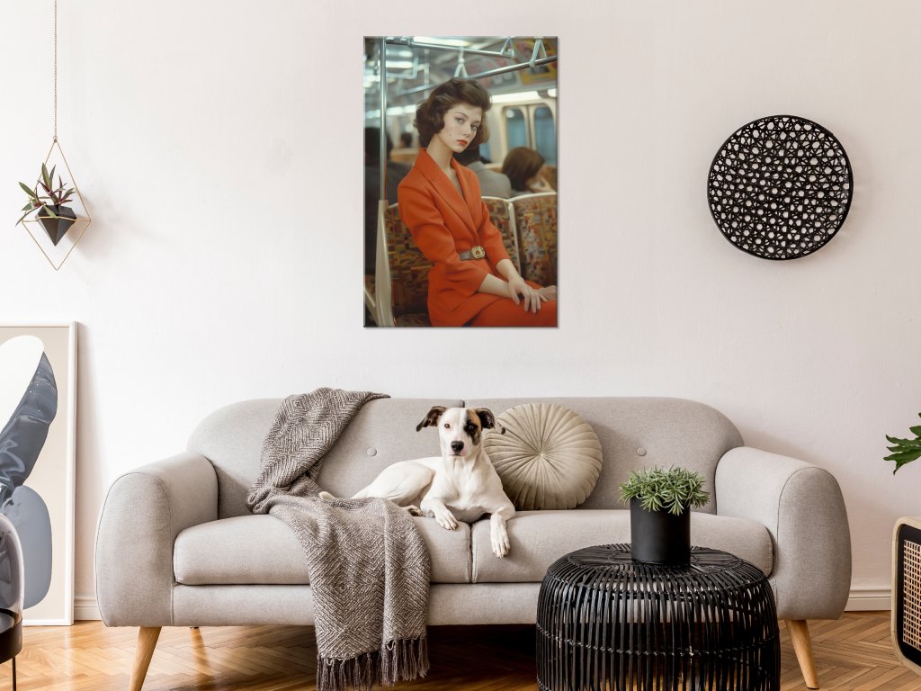 Tento obraz zachytáva mladú ženu v oranžovom saku s výrazným opaskom, ktorá sedí v metre. Jej elegantný vzhľad a uvoľnený postoj vytvárajú kontrast s rušným prostredím verejnej dopravy. Táto scéna zdôrazňuje jej jedinečný štýl a sebavedomie, ktoré vyžaruje aj v obyčajnom prostredí každodenného života.