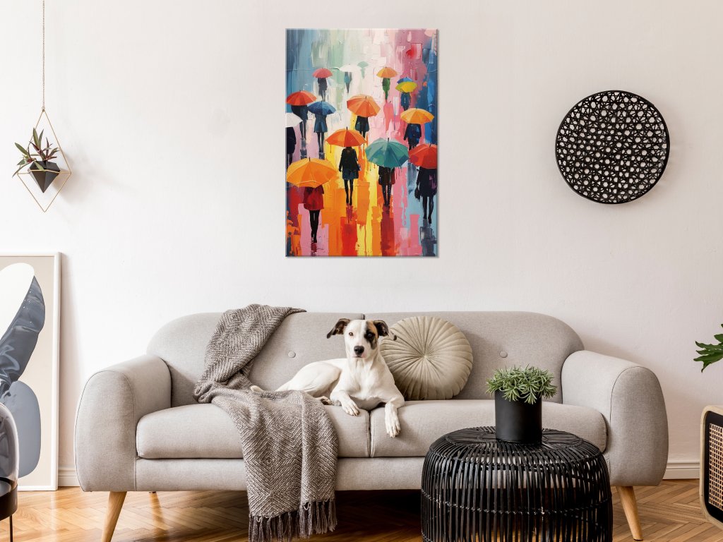 Obraz zobrazuje skupinu ľudí kráčajúcich ulicou, každý nesúci rôznofarebný dáždnik, ktorý rozjasňuje pochmúrny daždivý deň. Farebné dáždniky vytvárajú živý kontrast s tlmeným pozadím, čím dodávajú scéne dynamiku a energiu. Reflexie farieb na mokrej ulici umocňujú dojem pohybu a radosti napriek dažďu.