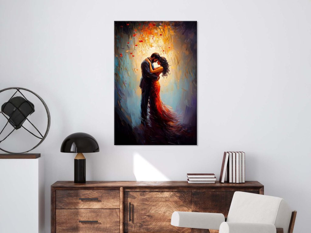 Uprostred snovej scenérie, kde svetlo a farby splývajú v jednote, sa milenci nežne objímajú, akoby svet naokolo prestal existovať. Jej šaty v ohnivých tónoch kontrastujú s jemnými líniami jeho obleku, čo vytvára harmóniu vášne a pokoja. Padajúce lupene a teplé svetlo podčiarkujú intimitu a magickosť tohto okamihu.