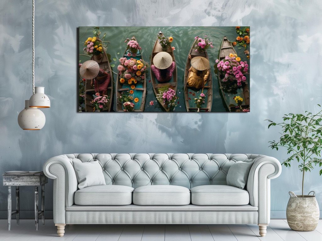 Osoby oblečené v tradičnom oblečení sediace chrbtom k divákovi v dlhých úzkych člnkoch naplnených rôznymi kvetmi, ktoré jemne plávajú na pokojnej vode. Tento obrázok zachytáva pokojnú atmosféru kvetinového trhu na vode, kde kvetinové aranžmány pridávajú farebnosť do miernych odtieňov okolitej prírody. Svieže kvety sú v kontraste s temnými vodami a poskytujú zmysel pre harmóniu a krásu.